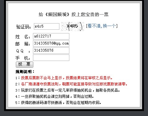2、输入正确的验证码、姓名、邮箱、QQ号、手机号码后,点击投票按钮。如下图: