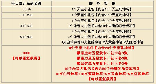 活动内容:在活动时间内,官方将对每天的充值账户以及金额进行统计。充值达到一定数值的时候,会得到官方额外的奖励,详细请看下表。