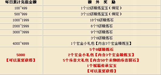 备注: ① 活动2的奖励物品和活动1的奖励物品是可以叠加获得的。 ② 活动2中5000元的的奖励道具是可以重复获得的。例如:充值10000元即可获得10个8级精炼石、4个玄金小礼包、10个乐音大礼包【内含50个未绑的乐音溟石】、2个祝福传承宝玉。