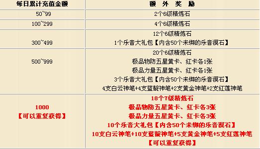 活动内容:在活动时间内,官方将对每天的充值账户以及金额进行统计。充值达到一定数值的时候,会得到官方额外的奖励,详细请看下表。