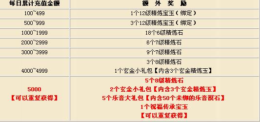 ② 活动2中5000元的的奖励道具是可以重复获得的。例如:充值10000元即可获得10个8级精炼石、4个玄金小礼包、10个乐音大礼包【内含50个未绑的乐音溟石】、2个祝福传承宝玉。