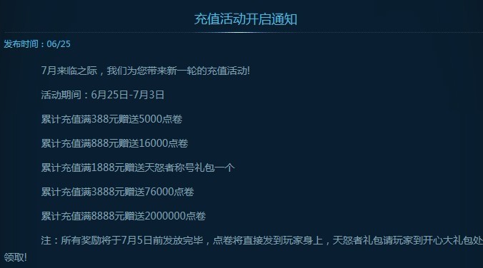累计充值满8888元赠送2000000点卷,送200W点啊,相当于买一件神装送3件神装啊!!!!!我的天哪