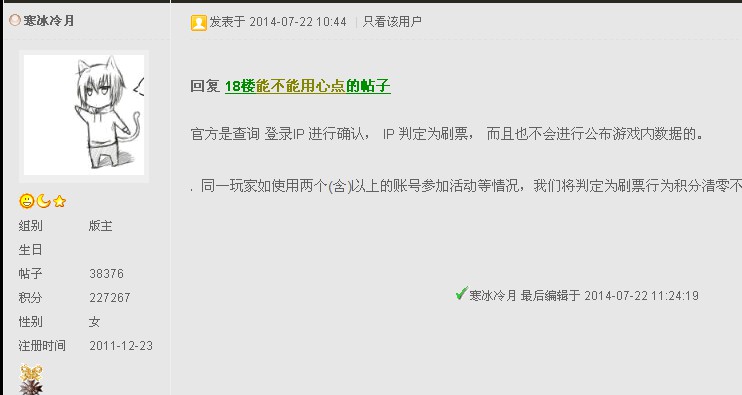 其次,针对版主的话,版主说了,官方没有给出具体什么叫刷票,那我想问,既然活动开始的时候,没说什么叫刷票,凭什么别人答了二个号,就叫刷票,何况很多人还不是答二个号,只是偶然上不来,让别人代答了一天,就无法领奖励。