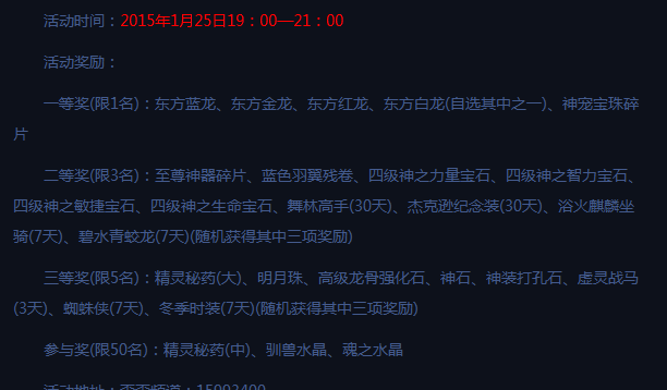 看下面的蓝龙,为何是7天的坐骑,*蓝龙给玩家,3等奖那里,不是永久的就用(7天)来标注,结果,一等奖的没标注,也是7天,虽然蓝龙是极品*,但是有哲理看到*