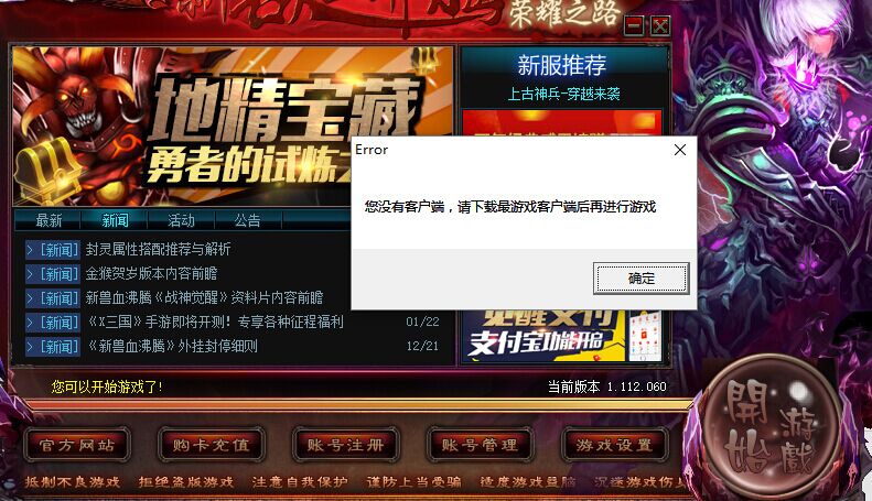 童鞋,你把你杀毒软件中兽血沸腾的文件添加到白名单中,在游戏的文件夹中直接运行游戏看看能不能正常运行,如果还是不行你关闭防火墙和杀毒软件,将原来安装的客户端完全删除,重新到官网下载一下客户端安装到其他盘符