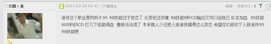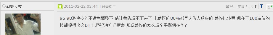幻舞丶夜你说的话都算不算数,你就回答一个问题:为什么你在满世界宣扬自己完虐游侠的同时,还在论坛上一个劲说游侠技能变态,兽族完全不是对手,要求削弱游侠。回答不出来你以后也别再论坛说话了,你说的话哪句话是事实?人家都是说一套做一套,你倒好,还没做呢,光说就两套。你就是想在论坛炫耀自己
