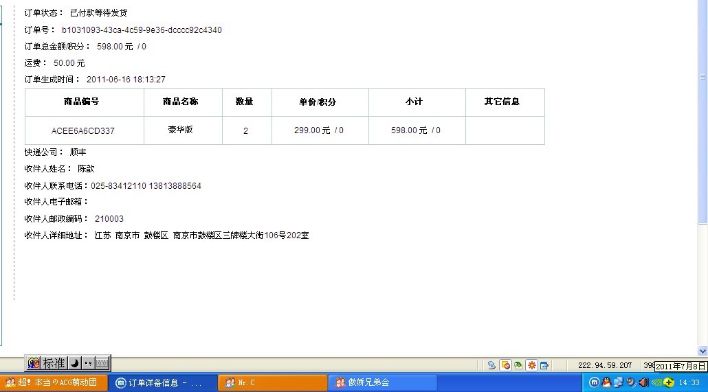 关于我的第一批预售的订单..请告诉我你们几点发的货!今天8号了 下午了2点多了我还没收到货!2套豪华版!如果你发了 告诉我什么时间发的 或者订单号 我自己去顺丰查去! 别说些敷衍的话 OK??我第一批货 居然现在都没收到 我弟的侄子第2批货的 都收到了!着什么情况 而且都是南京