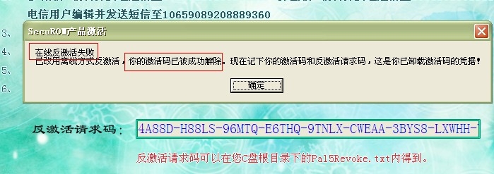 已改用离线方式反激活,你的激活码已被成功解除。现在记下你的激活码和反激活请求码,这是你已卸载激活码的凭据!