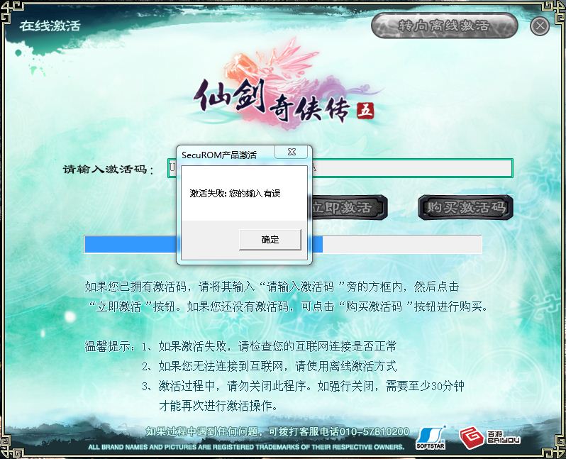 请您在核对您的激活码后再尝试激活,同时您在输入激活码时是要输入“-”连接符的并不是“_”,还请您了解。希望我的回复能够帮助到您,感谢您对《仙剑奇侠传五》的支持。