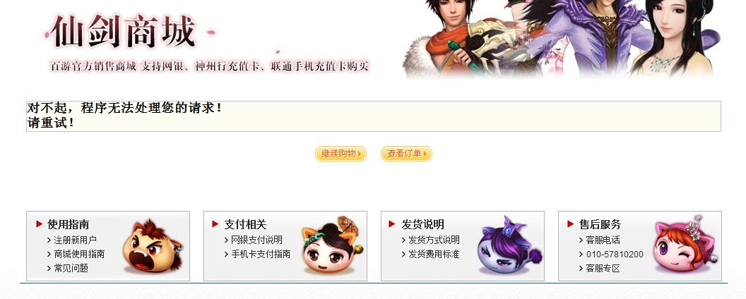 在仙五商城买激活码时。结算时提示说:对不起,程序无法处理您的请求!