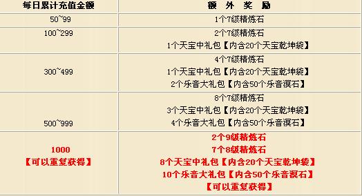 活动内容:在活动时间内,官方将对每天的充值账户以及金额进行统计。充值达到一定数值的时候,会得到官方额外的奖励,详细请看下表。