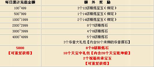 ② 活动3中5000元的的奖励道具是可以重复获得的。例如:充值10000元即可获得16个8级精炼石、20个天宝中礼包、4个祝福传承宝玉。