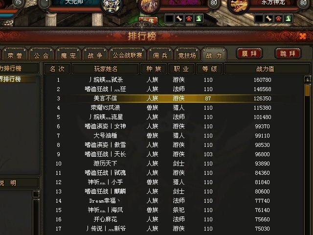 战力到底怎么排的?有什么依据。第三竟然是80多级的。。难道110级带神装竟然没87级战力高????求真相,至少让玩家知道战力到底是什么啊。。搞得大家一头雾水