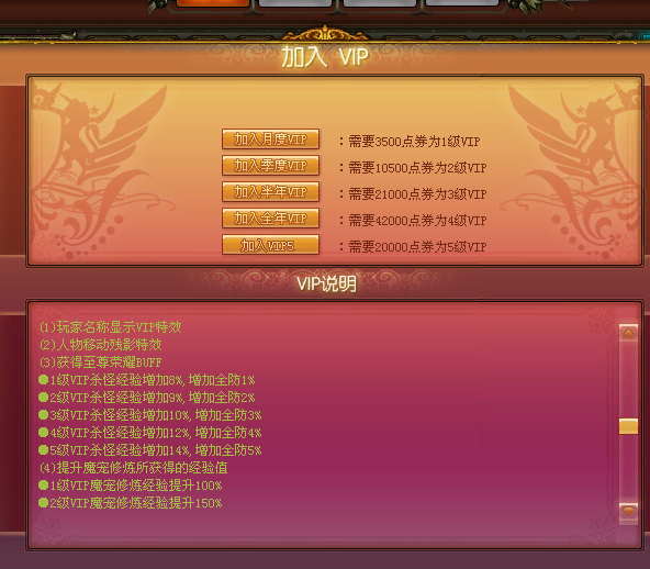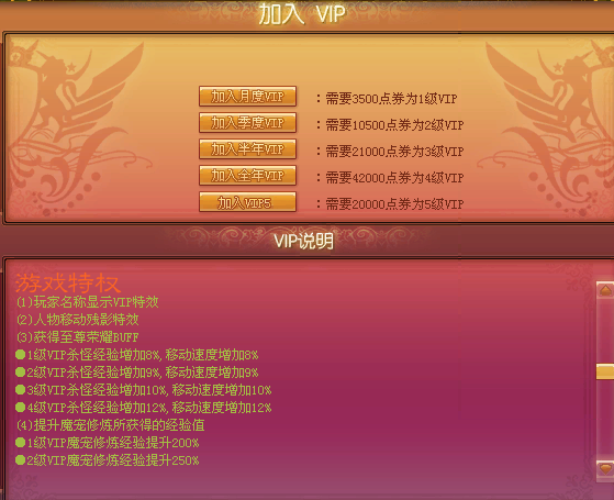 20000点券30天的时间,但是购买的时候,没注明有什么特别的特别之处,就聊天时的蓝色字和去管家那领个道具?那其他呢?和其他VIP一样吗?谁能说说,VIP5有什么BUFF?
