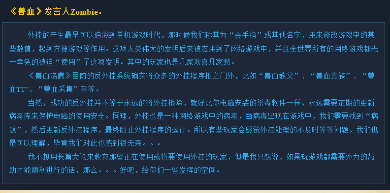 这是兽血新帖里面的一段话 我复制给大家看,大家注意最后一段话 言外之意 就是官方已经默认外挂了!!!!!!