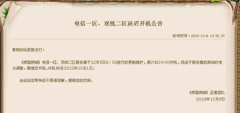 《倾国倾城》电信一区服务器于12月8日6:00进行的更新维护,原计划14:00开机,现由于服务器机房临时电力调整,需推迟开机。服务器具体开放时间请玩家朋友们留意官网后续公告。