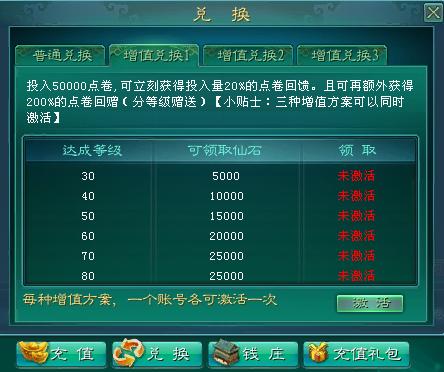 此先“凡人”中开通的“增值兑换”系统,得到了许多玩家的关注。具体的操作步骤为:先充值所要参加的“增值兑换”所需要的点卷,注意,充值后不能兑换成仙石,否则就无法参加咯!