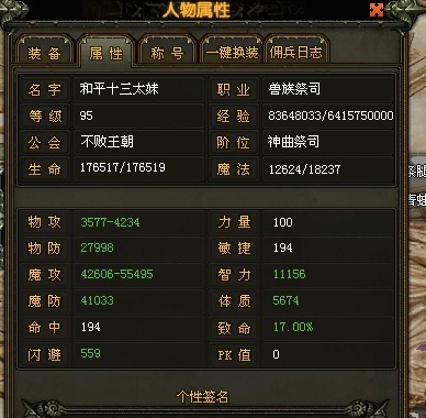 你光发一个人的属性有什么用?在发个同等级别,同等装备的游侠属性看看?比较一下才知道的。你这样一发,60级以下的肯定看这个祭祀都很牛B