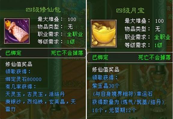 四级修仙包(100修仙值) | 绑定灵石80000、古灵玉、天雷竹等 |