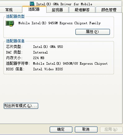 你好,目前电脑的显卡是Mobile Intel(R) 945GM Express Chipset Family,显存大小是224MB,内存是2G,硬盘大小320G也够用。