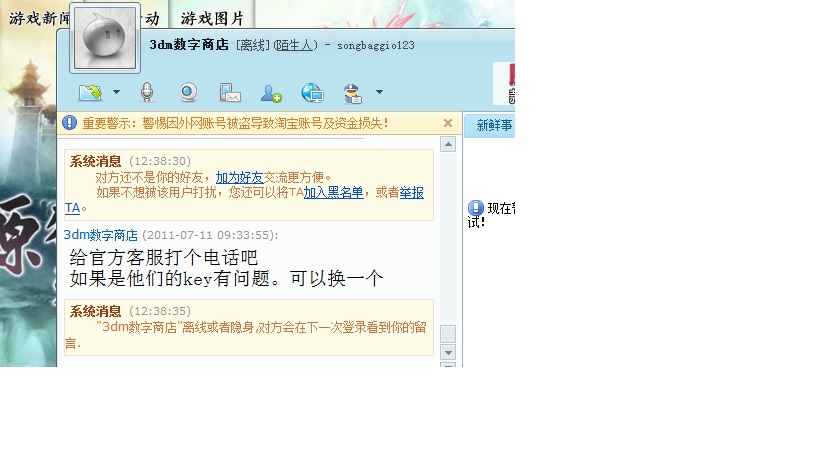 我在淘宝3dm网店买的数字版,激活失败,显示“游戏激活次数过多,错误码76”,今天还是失败了。3dm客服让我打电话到官方热线,说如果key有问题可以重新发一个激活码。打了一上午官方服务电话打不通,请问GM该怎么办?从来都是仙剑的正版用户,希望不是被推皮球了。如果更换key,该怎么操作?这种情况有很多了,我周围有2个朋友都是这样,一次都没激活却说“激活次数过多”,请官方认真对待每一个正版仙剑玩家!!
