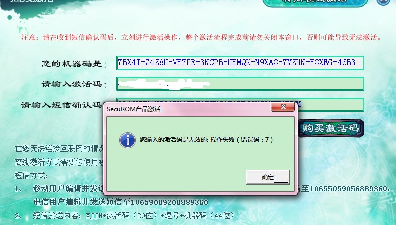 错误代码7为你输入有误,请您确认您输入的正确性,需要提醒您激活码和短信确认码中的“-”都是需要输入的。如您确认输入正确依旧存在此问题,请您登录我们的客服中心