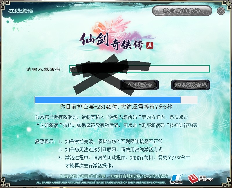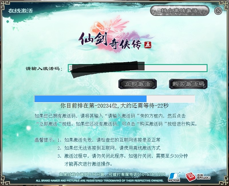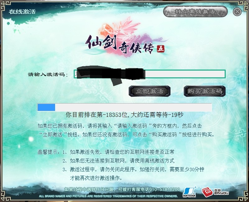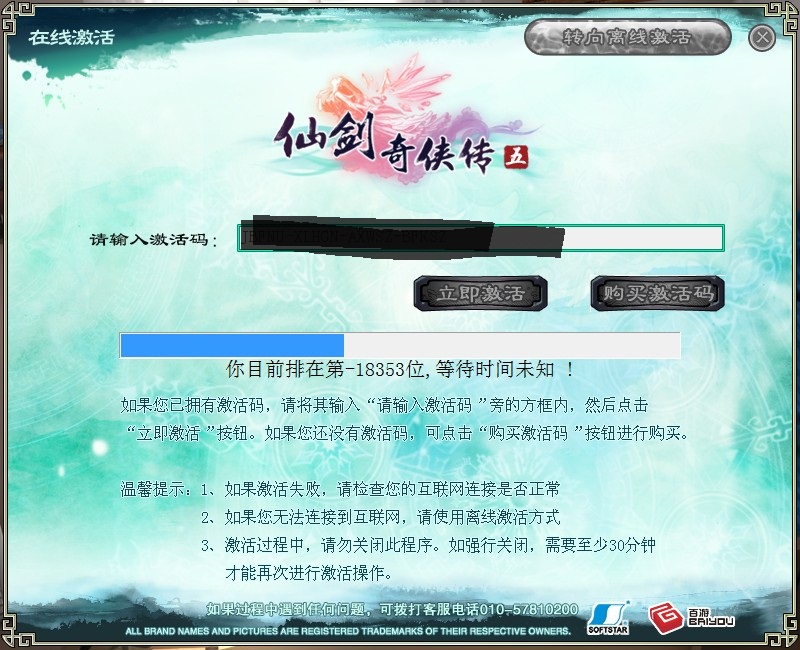 关于您的问题,建议您换个时间段再进行激活或者使用离线激活,请您点击http://pal5.baiyou100.com/help/jh.html,查看离线激活的操作方法,感谢您对本游戏的关注!