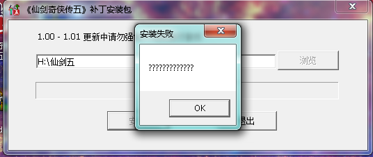 您好!我在前一段时间购得首发版仙五一套,却发现补丁(我下载了两次,一次在客户端上自动下载,一次手动到官网上下载。)下载后无法安装。报出:安装失败,下面一排“?”,再下面是确定。单击确定后就又回到"capture"那张显示的地方了。 现在都1.02了跪求急速解决。