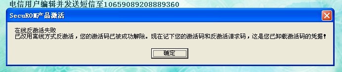 您在线反激活失败,建议您使用离线反激活方式进行操作。您可以在c盘下找到一个叫pal5revoke.txt的文件,里面包含您的反激活请求码,将它按照固定格式(xjfj+激活码+“,”+反激活请求码)同时依照您手机的服务提供商(移动、联通或者电信)发送到指定号码来完成反激活。详情参见